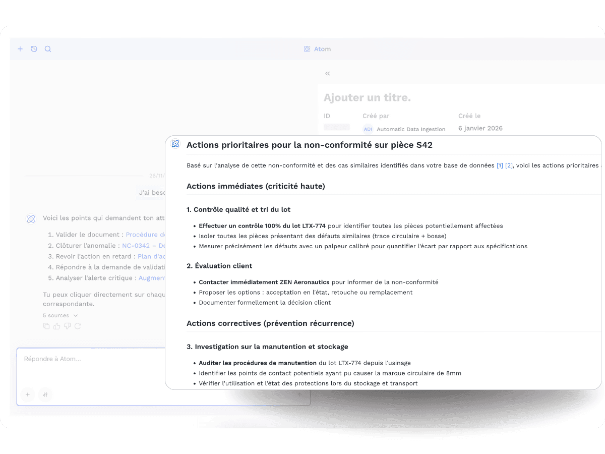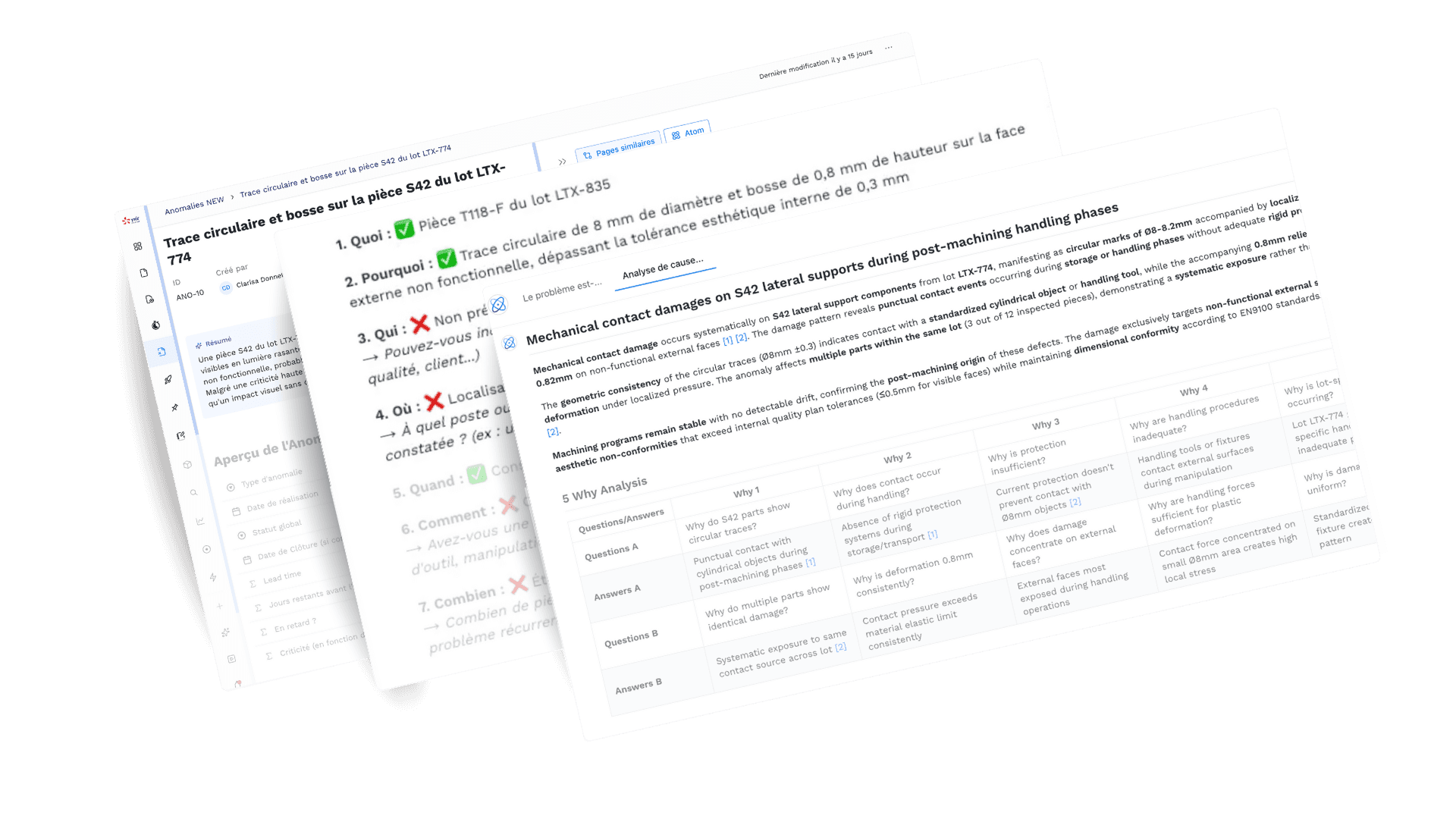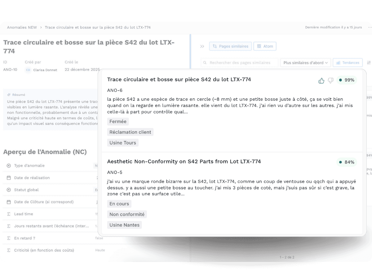 À partir de la non-conformité déclarée, l’IA analyse vos données historiques pour identifier les cas similaires, le contexte pertinent et les informations à consulter pour comprendre la non-conformité.